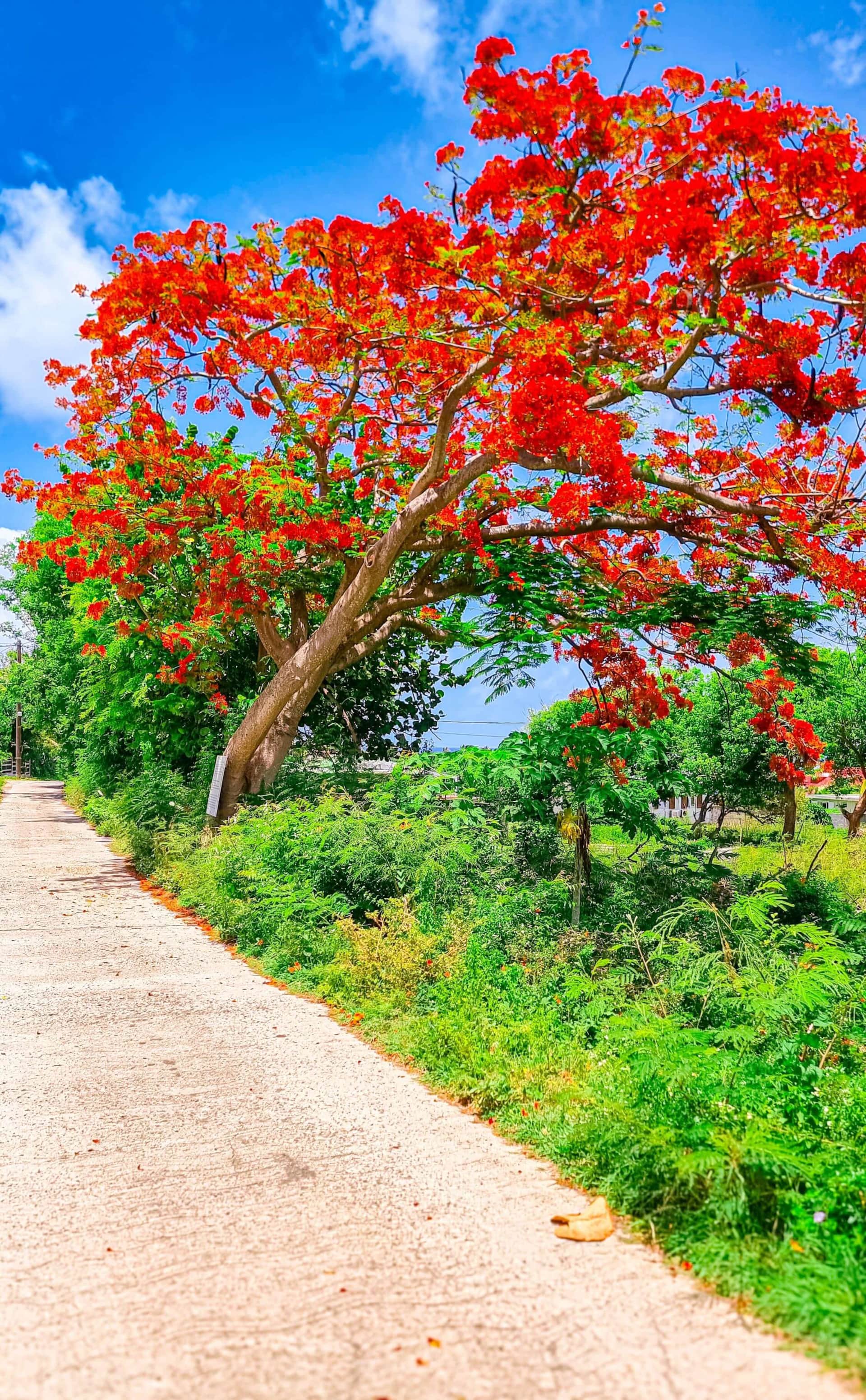 Flamboyant rouge (Delonix regia) – arbre ornemental qui éclaire l’île de ses fleurs rouges flamboyantes.