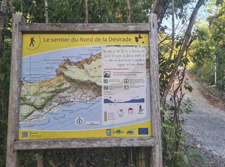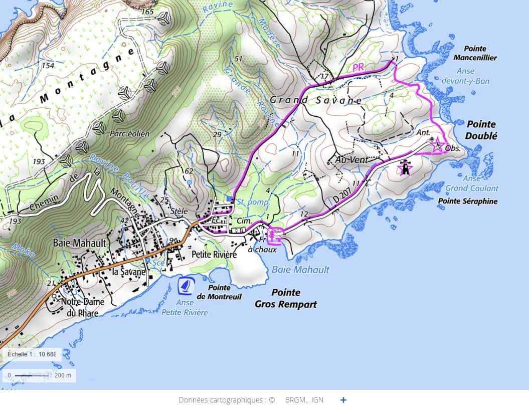 Points d’intérêt : En partant de la chapelle de la léproserie, passage devant le cimetière marin de Baie-Mahault, puis l'ancienne cotonnerie. Le matin de nombreux iguanes se trouvent au carbet de l'ancienne cotonnerie. Passage par la réserve géologique, le phare et la station météo. Continuer au nord en suivant la côte puis retour par la route de la déchetterie, retour à la chapelle de la léproserie.